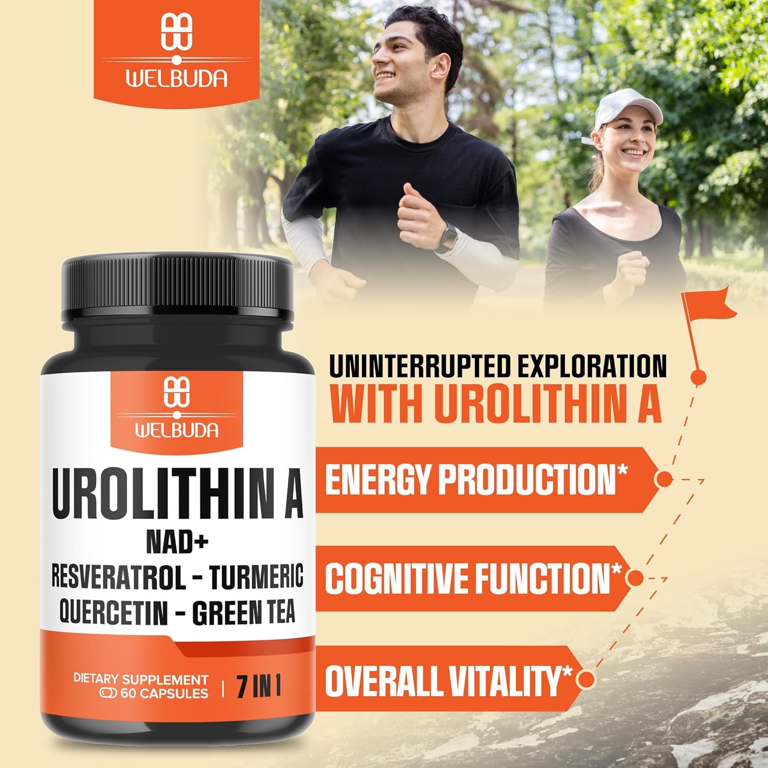 Beneficios dirigidos: Suplemento Urolitina A+ diseñado para apoyar la producción de energía, la función cognitiva y la vitalidad general tanto para hombres como para mujeres.